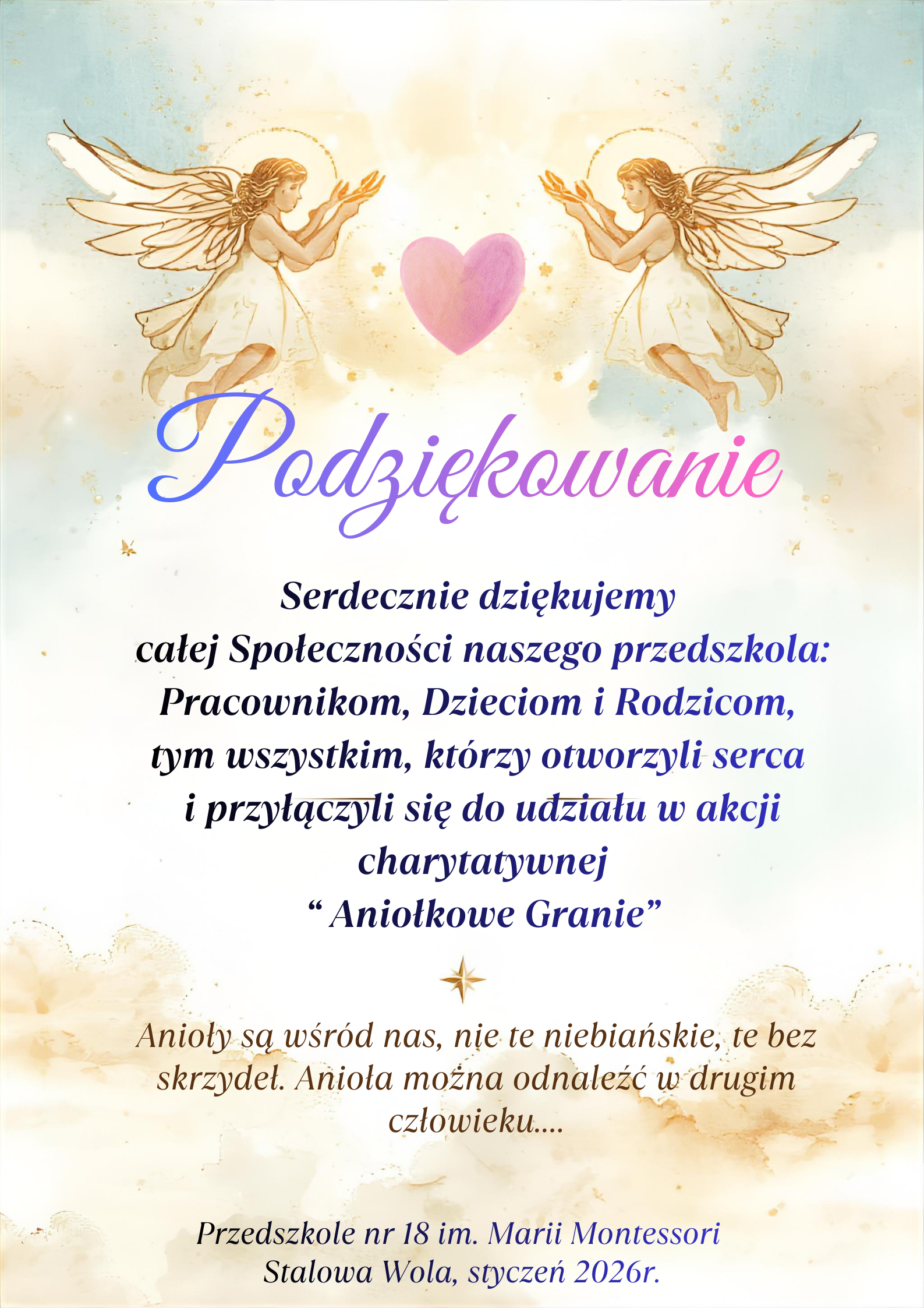 Społeczność naszego przedszkola po raz dziewiąty włączyła się do udziału w ogólnopolskiej akcji ANIOŁKOWE GRANIE